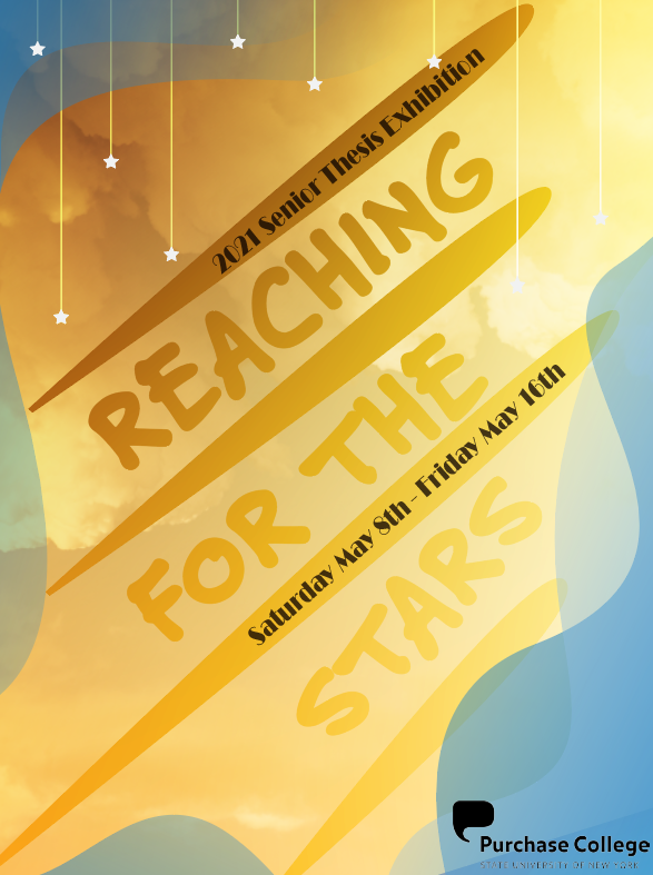 Gradients and abstract shapes play a part in this exhibition poster. A light cloud background is applied with simplified stars hanging from the top. Special treatment is applied to the text with lines surroundingĀ the title to represent a shooting star.